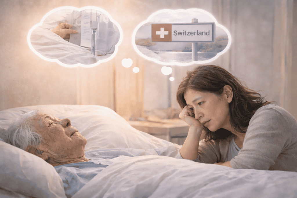 在缺乏合法選項的制度下,照顧者的壓力如何被放大,也讓「想選擇尊嚴死亡」的病人不得不飛往海外,前往如瑞士等國,才能完成合法協助死亡。
